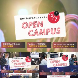 オープンキャンパス12月の情報を公開しています!! ◎12月 7日(日) 初めての方におススメ!時間を選んで参加出来ます! AM開催/10:00-12:00 PM開催/13:00-15:00 そちらの時間に参加してもOKです♪ ◎12月20日(土) 13メニューから1つの実習を選んでじっくり体験! クリスマスイベント開催!! ◎12月21日(日) 興味の有るメニューを2つ選んで体験できる「W体験DAY」開催! 参加待ちしています♪